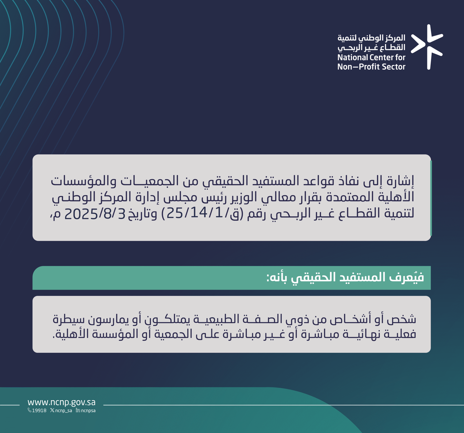 يسرنا أن نُشارككم هذه الرسالة التوعوية، والتي تأتي في إطار سعي المركز الوطني لتنمية القطاع غير الربحي على رفع وتعزيز مستوى وعي منسوبي المنظمات غير الربحية بالمواضيع والمستجدات المرتبطة بالمستفيد الحقيقي، ونأمل منكم مشاركة هذه الرسالة التوعوية مع جميع منسوبي المنظمة، لتصل لأكبر شريحة ممكنة.